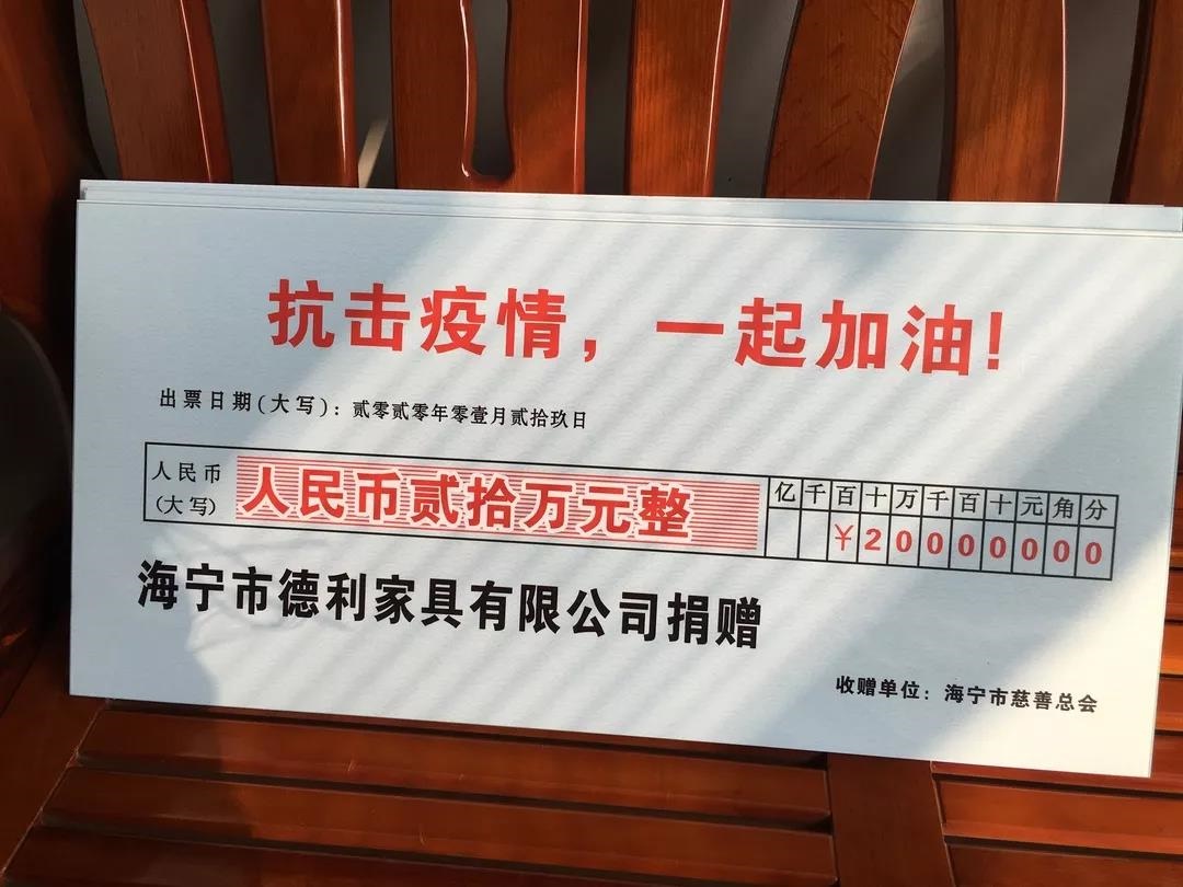 1月29日下午,海寧市德利家具有限公司向海寧市慈善總會捐贈20萬元,其中10萬元定向捐贈給周王廟鎮人民政府,用于疫情防控所需。